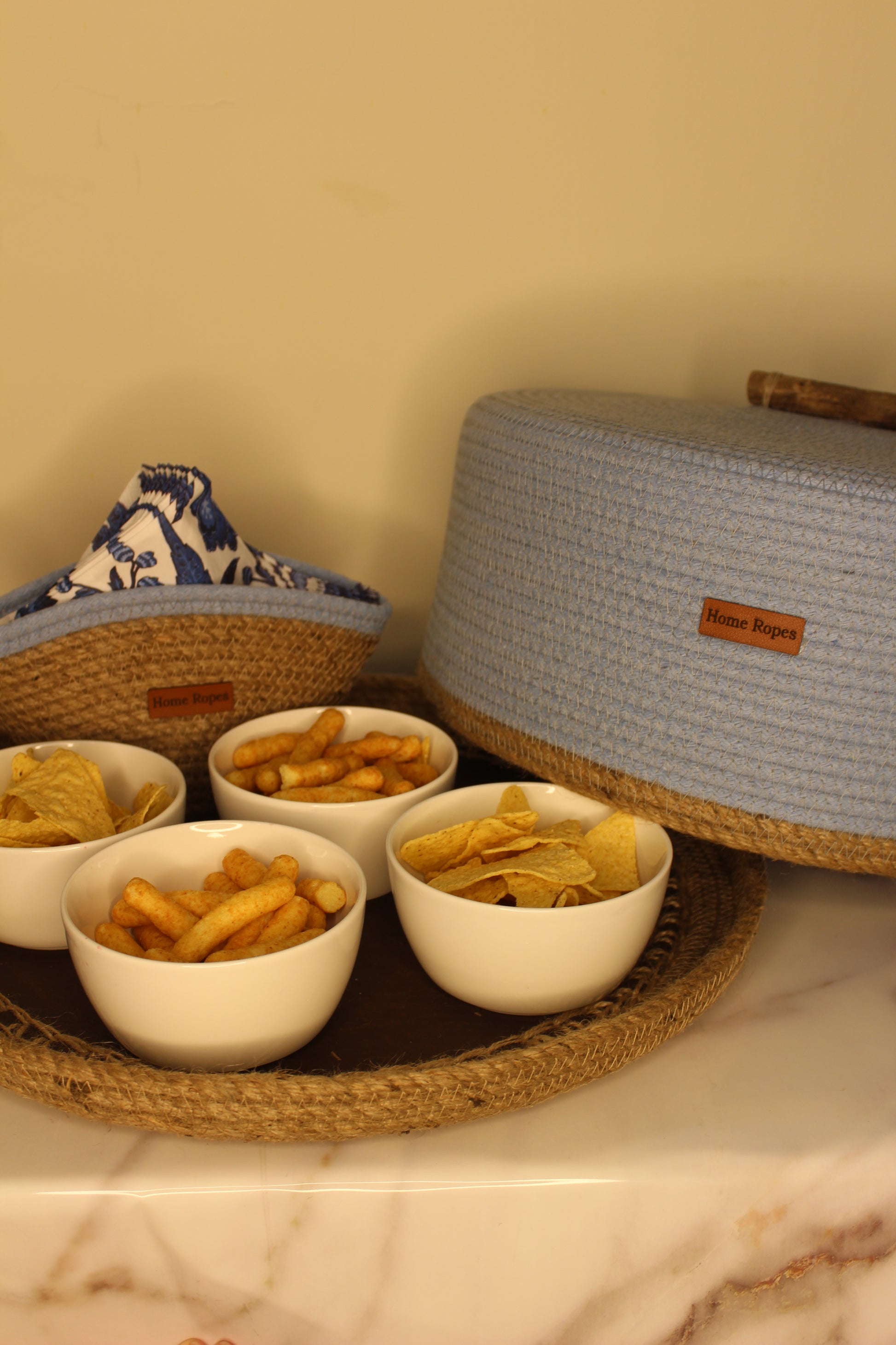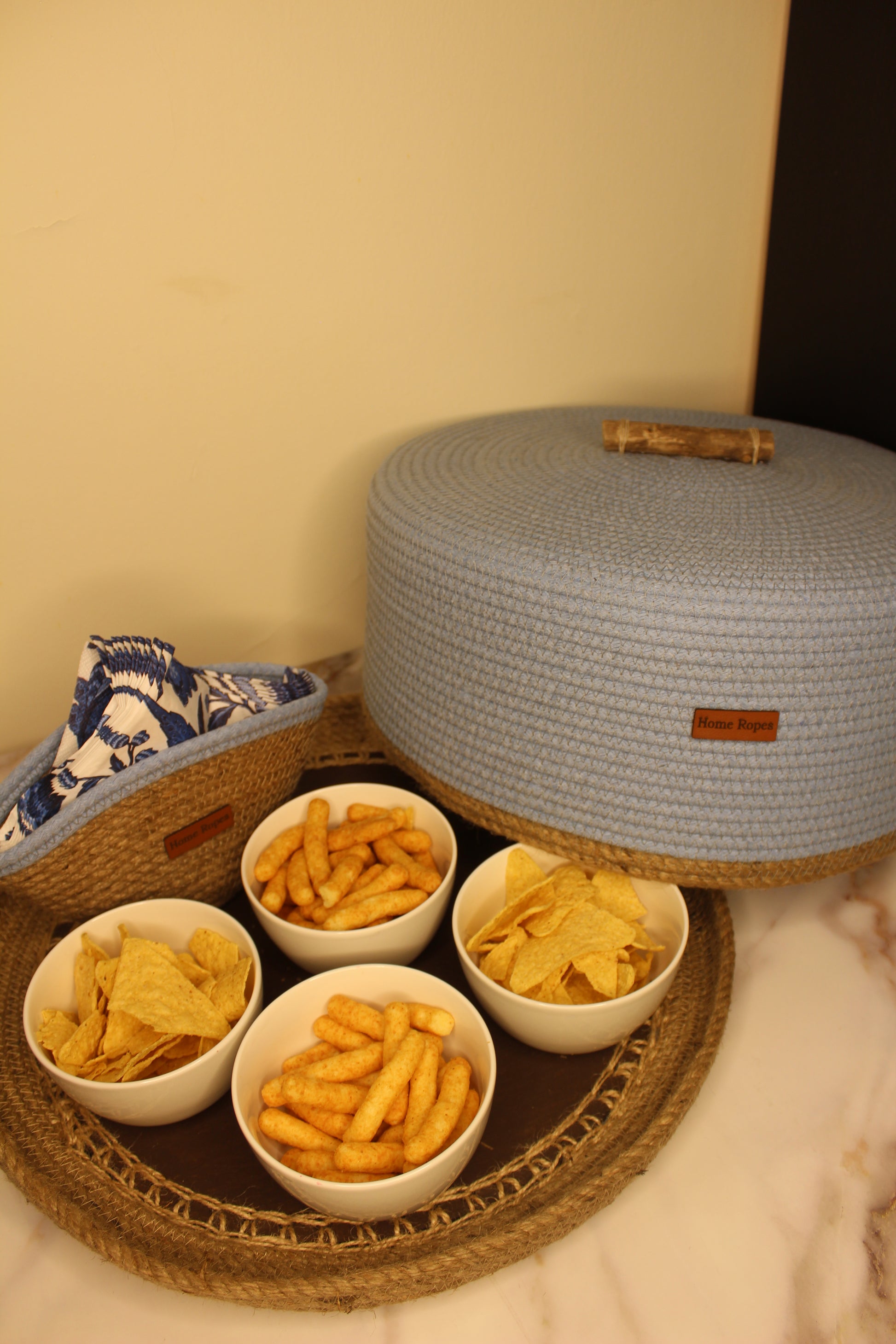 Handmade natural jute bread basket Detachable, with a lid and a handle at the top. with tissue box and 2 bowls with lid .
