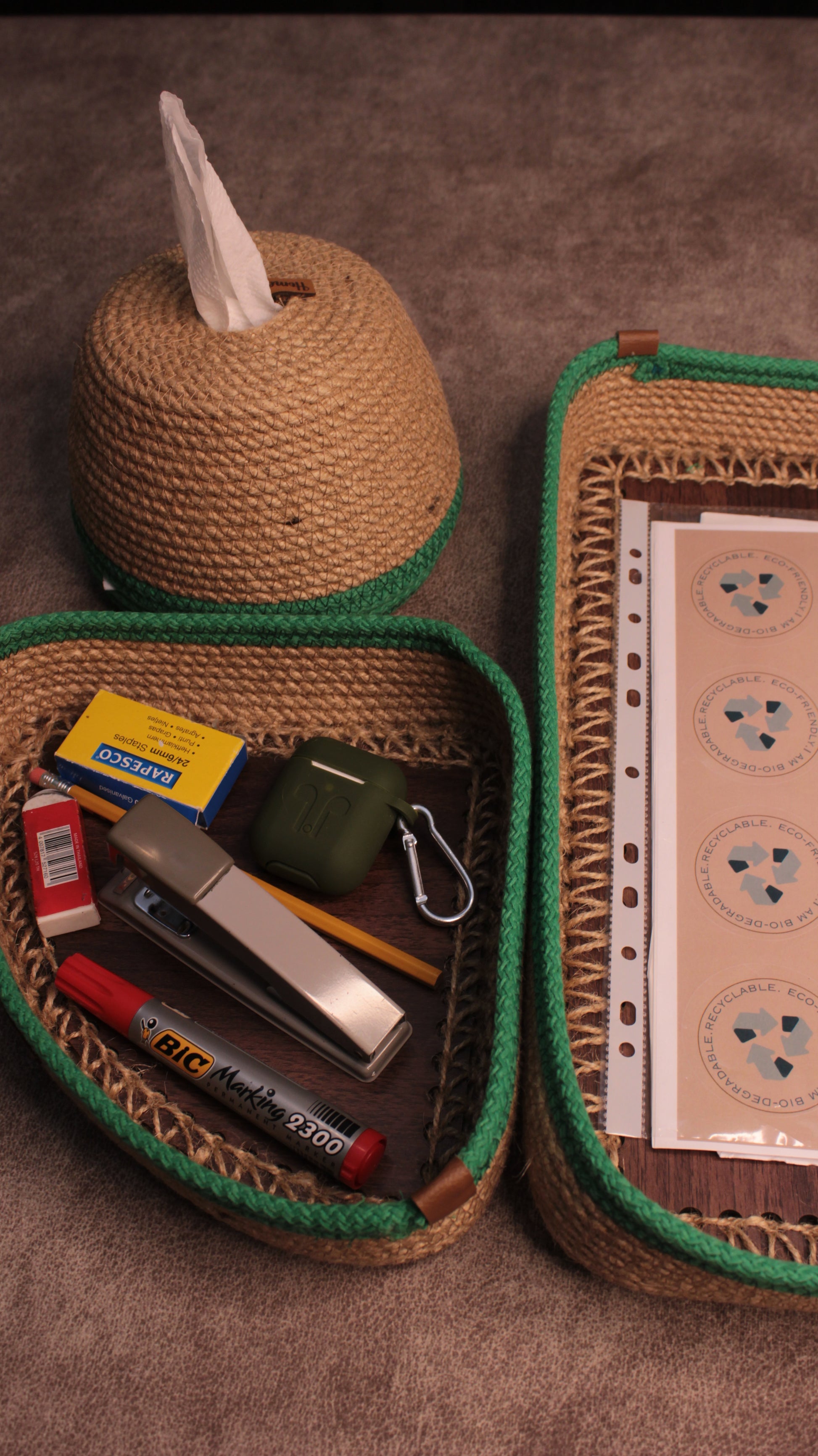 set of 3 for office - rectangular basket with wood base for paper or to serve , tissue box, corner basket