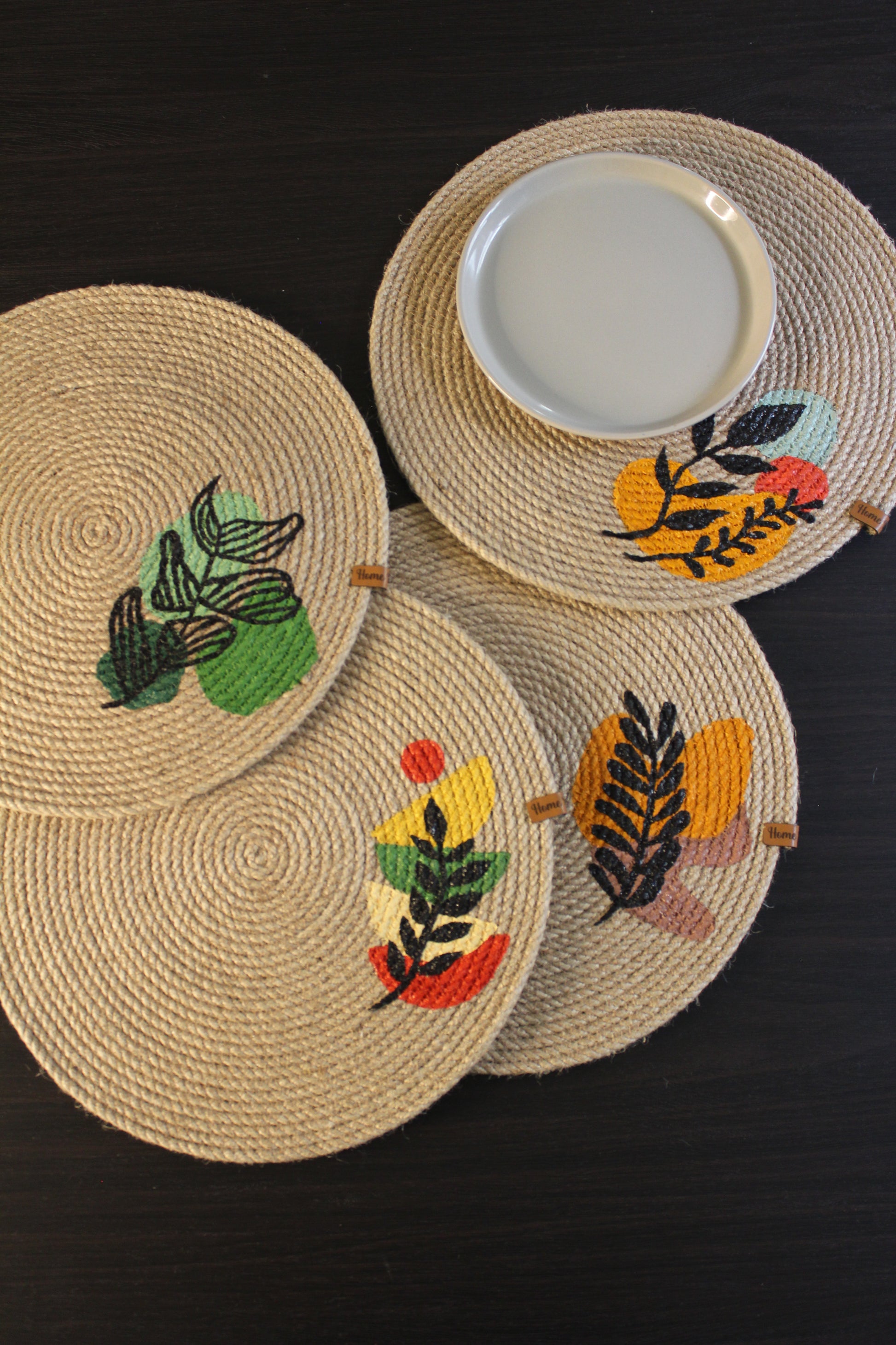 A set of 4 handmade jute placemats with handpainted designs. Washable, flame-resistant, and perfect for adding elegance to your table.