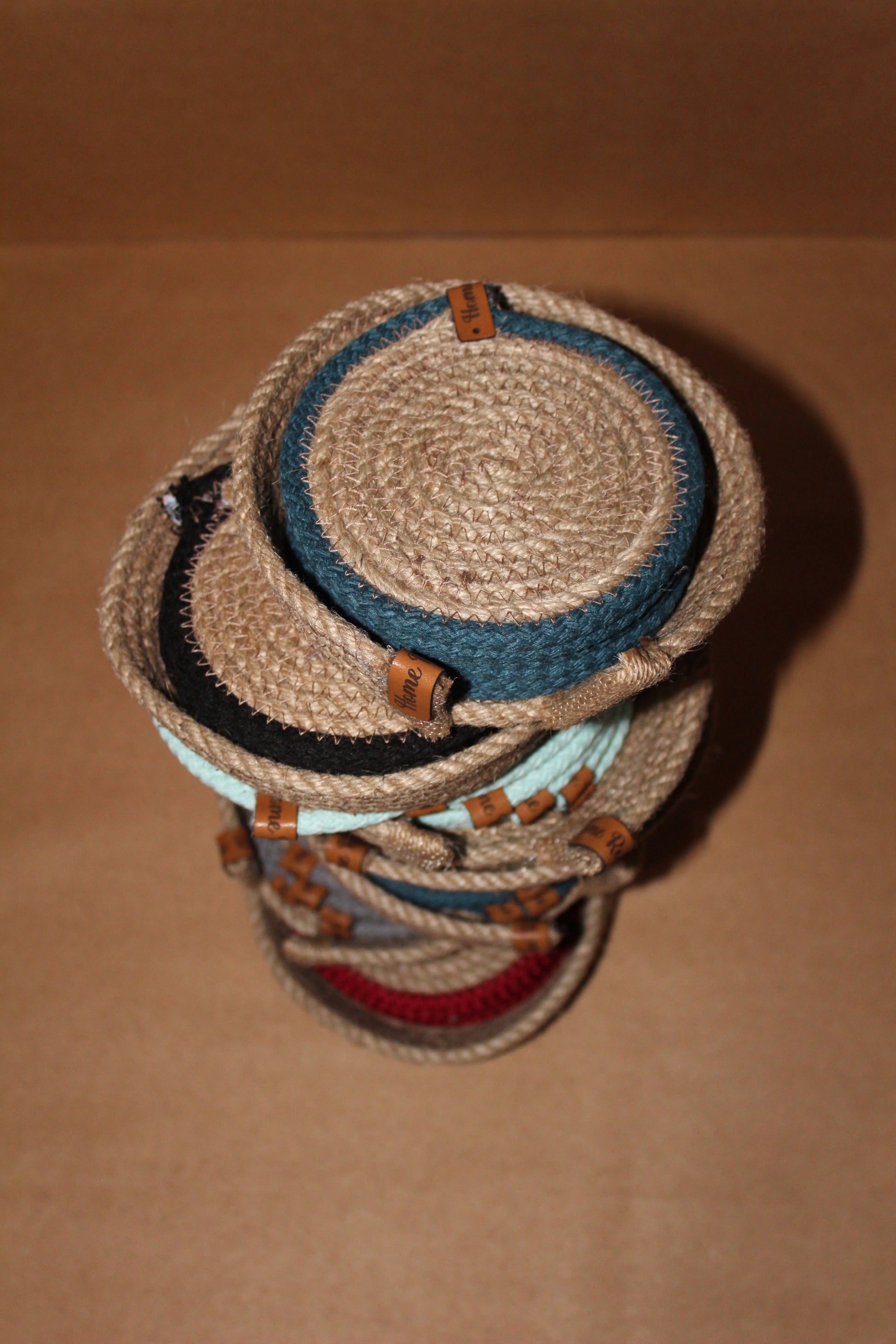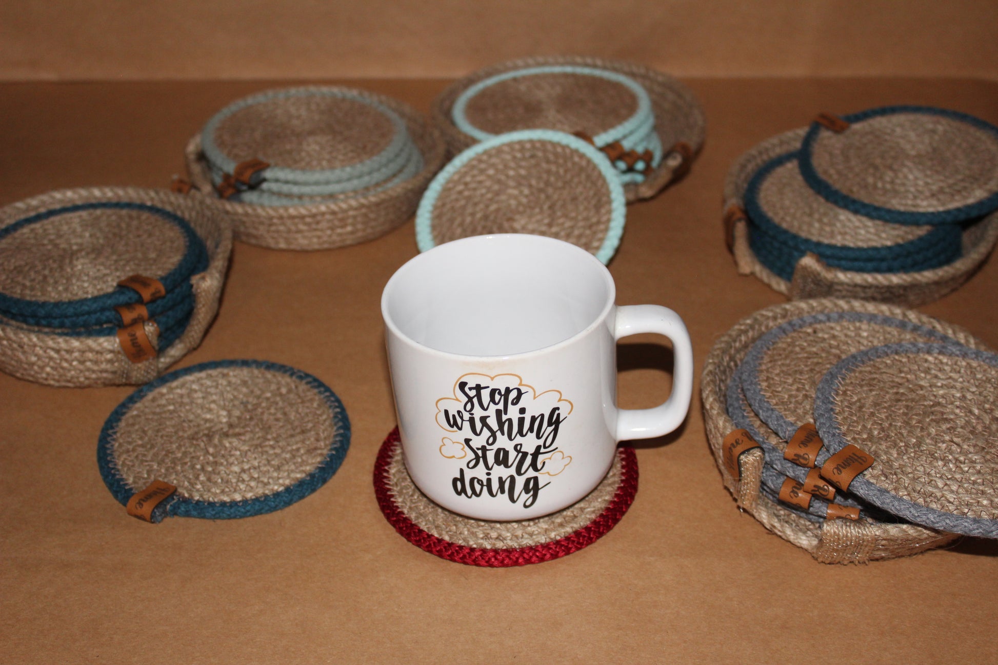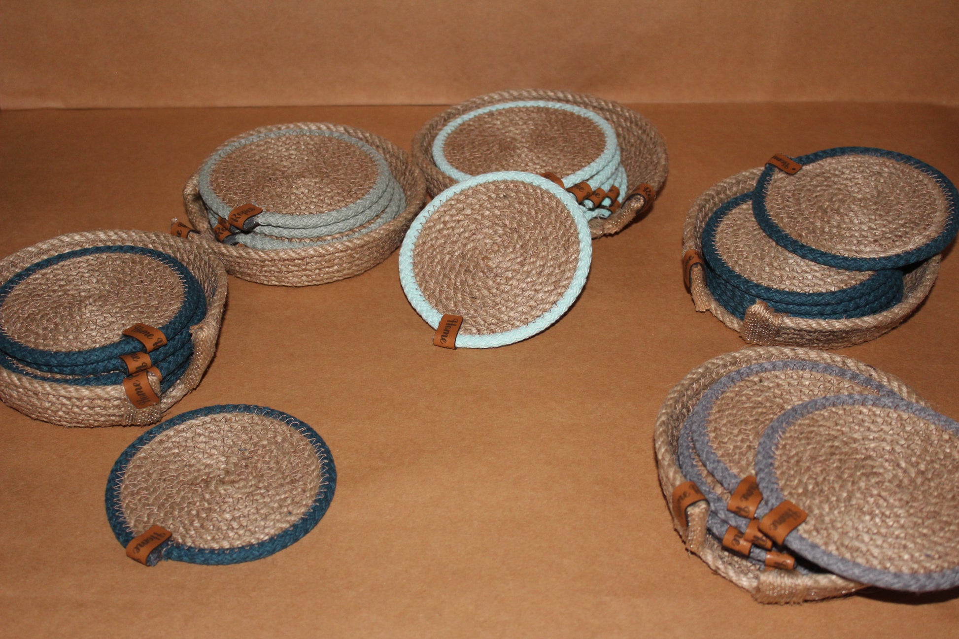 Set of 6 coasters with holder, round jute, and colored border