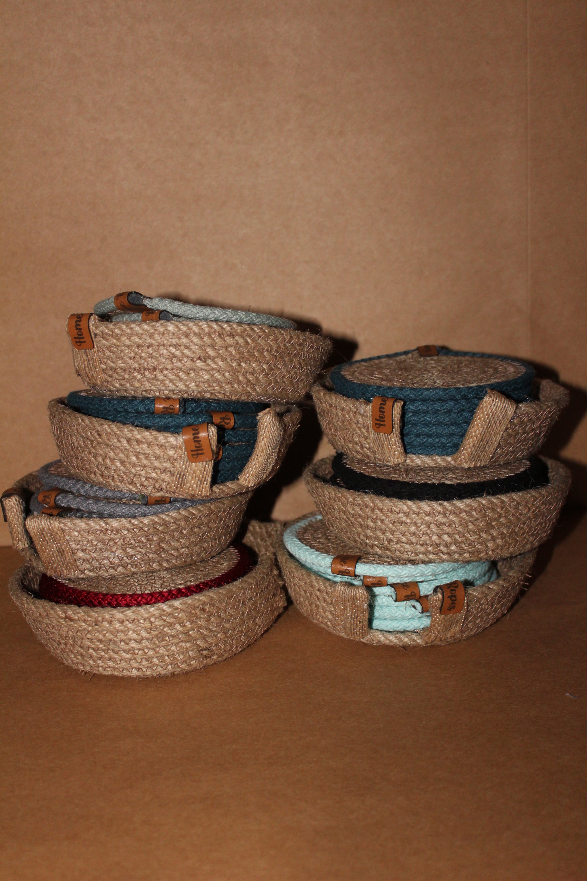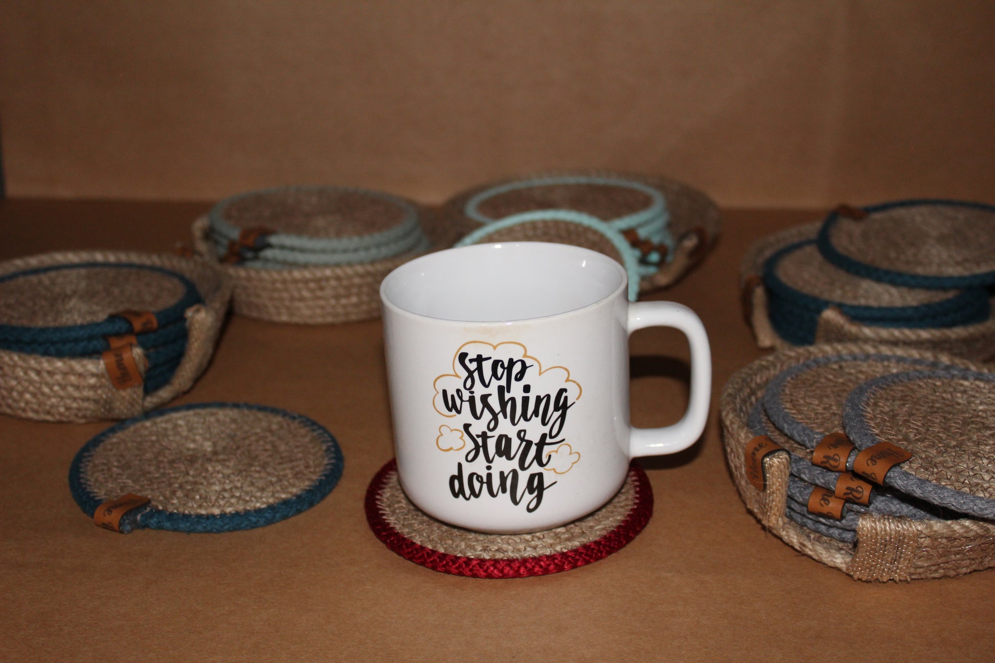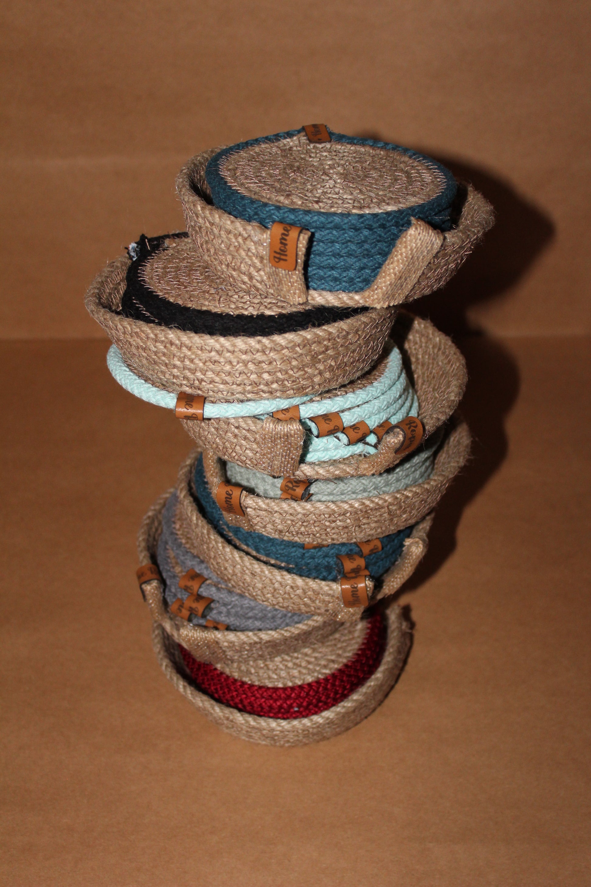 Set of 6 coasters with holder, round jute, and colored border