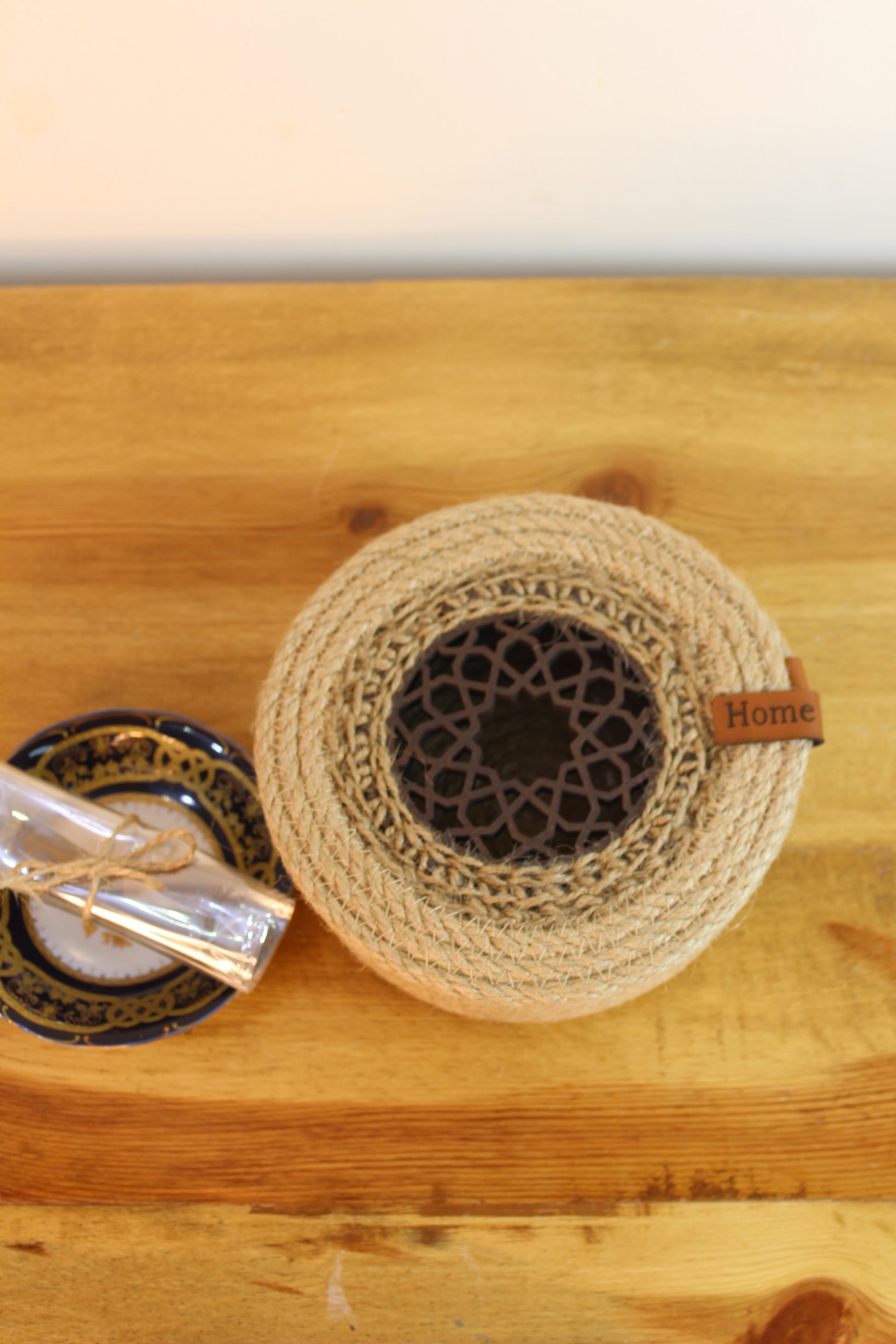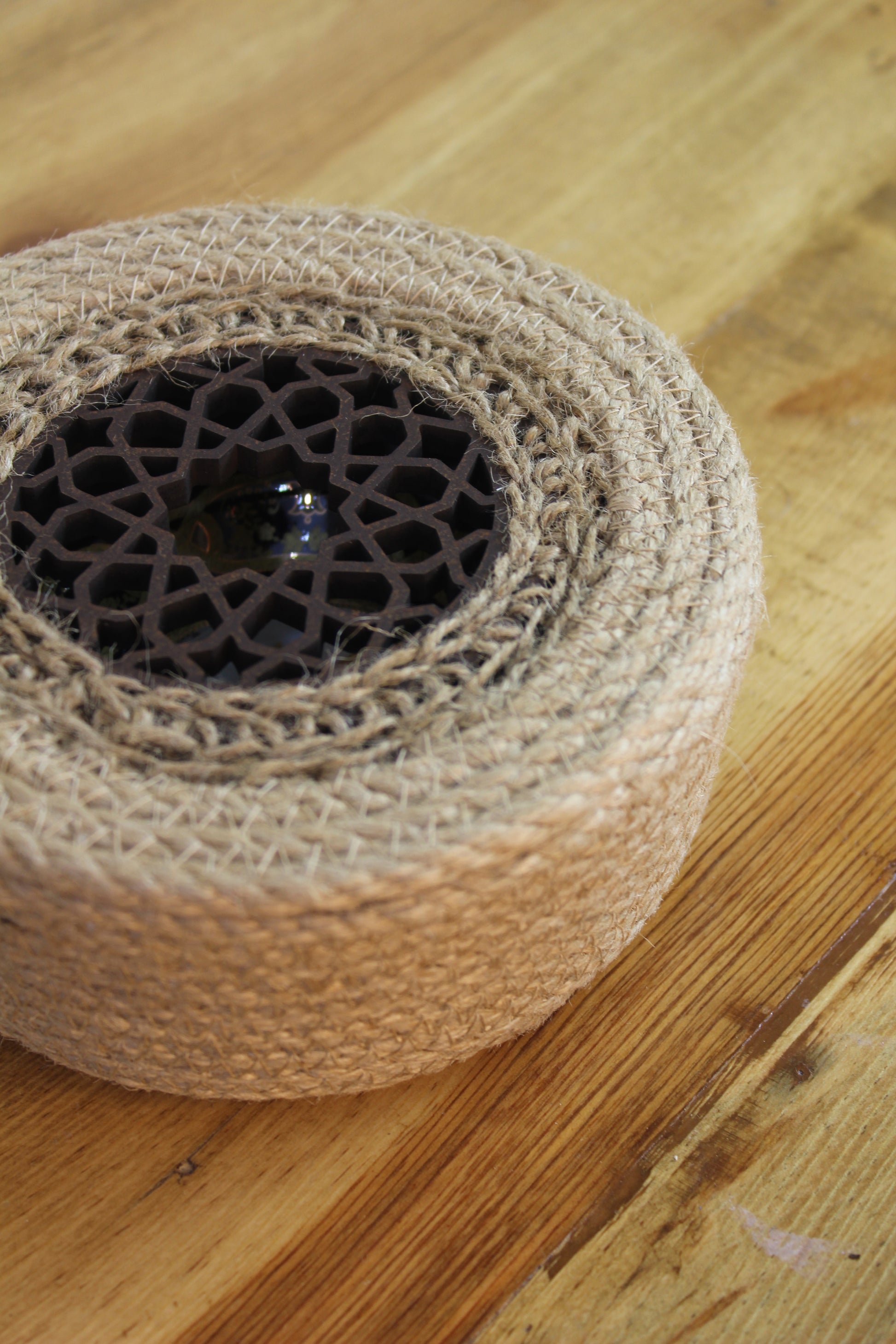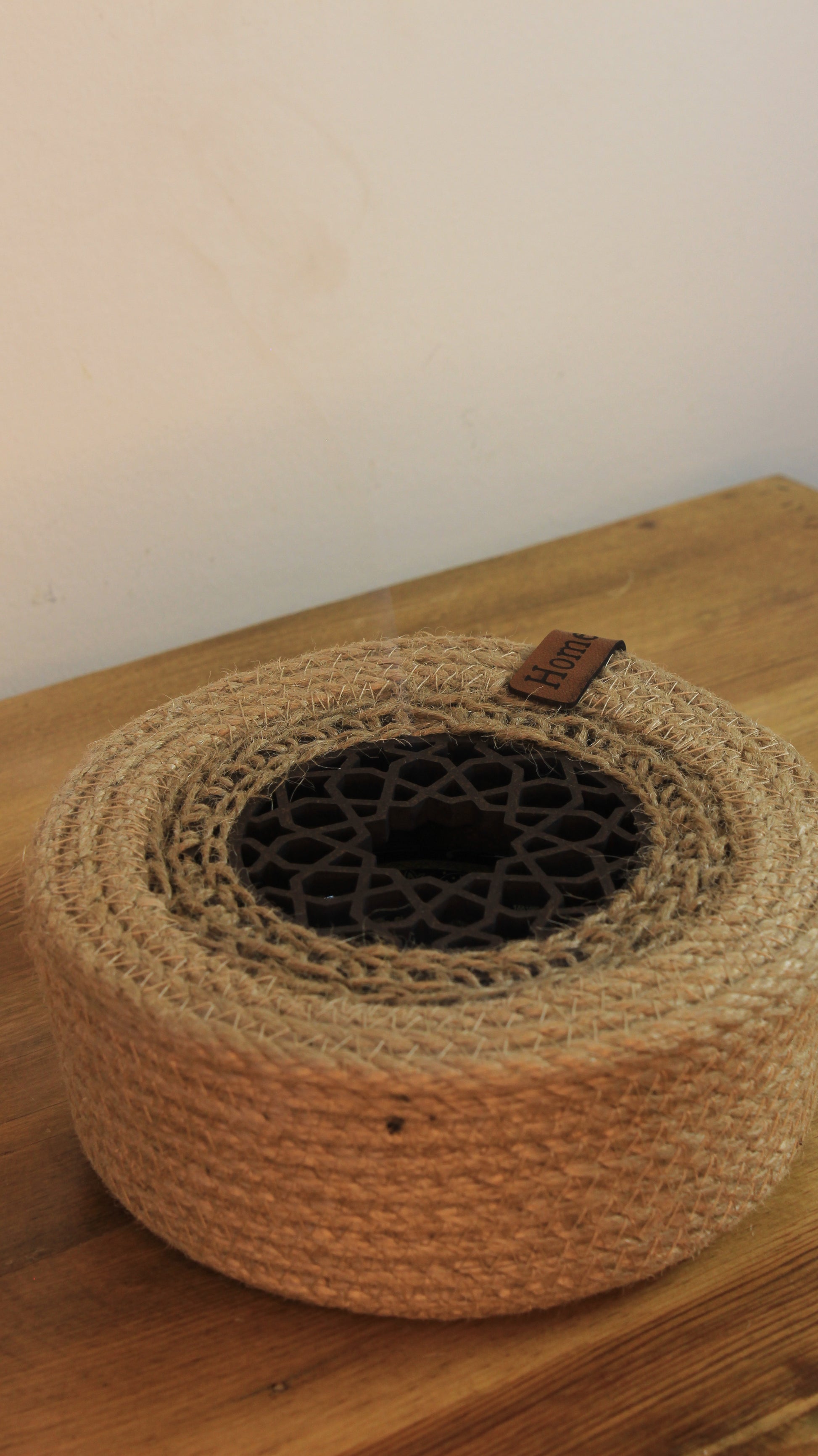 This handcrafted incense holder features a wooden top inspired by traditional Lebanese tile patterns, paired with a natural jute body β compact in size, rich in detail.