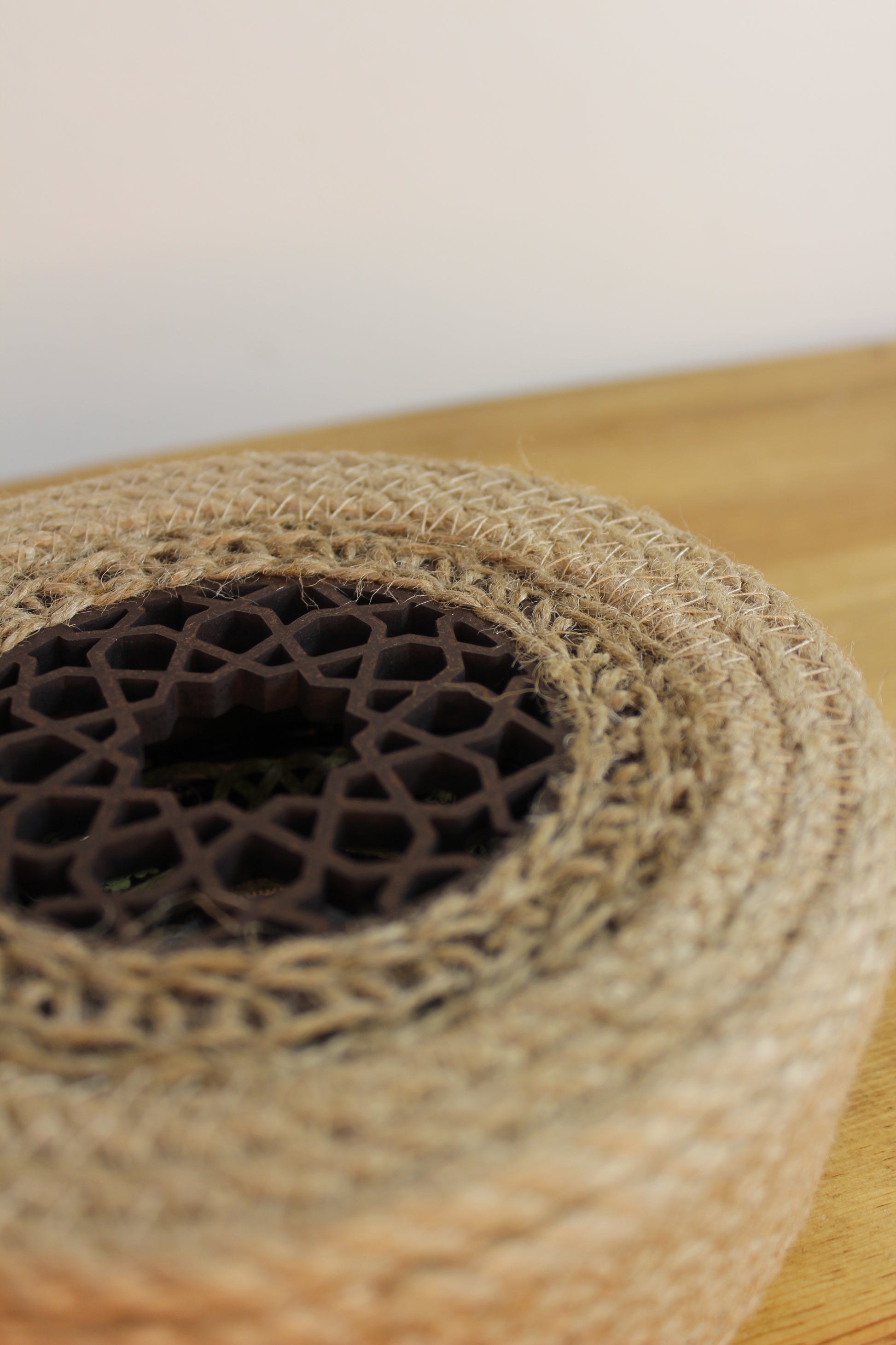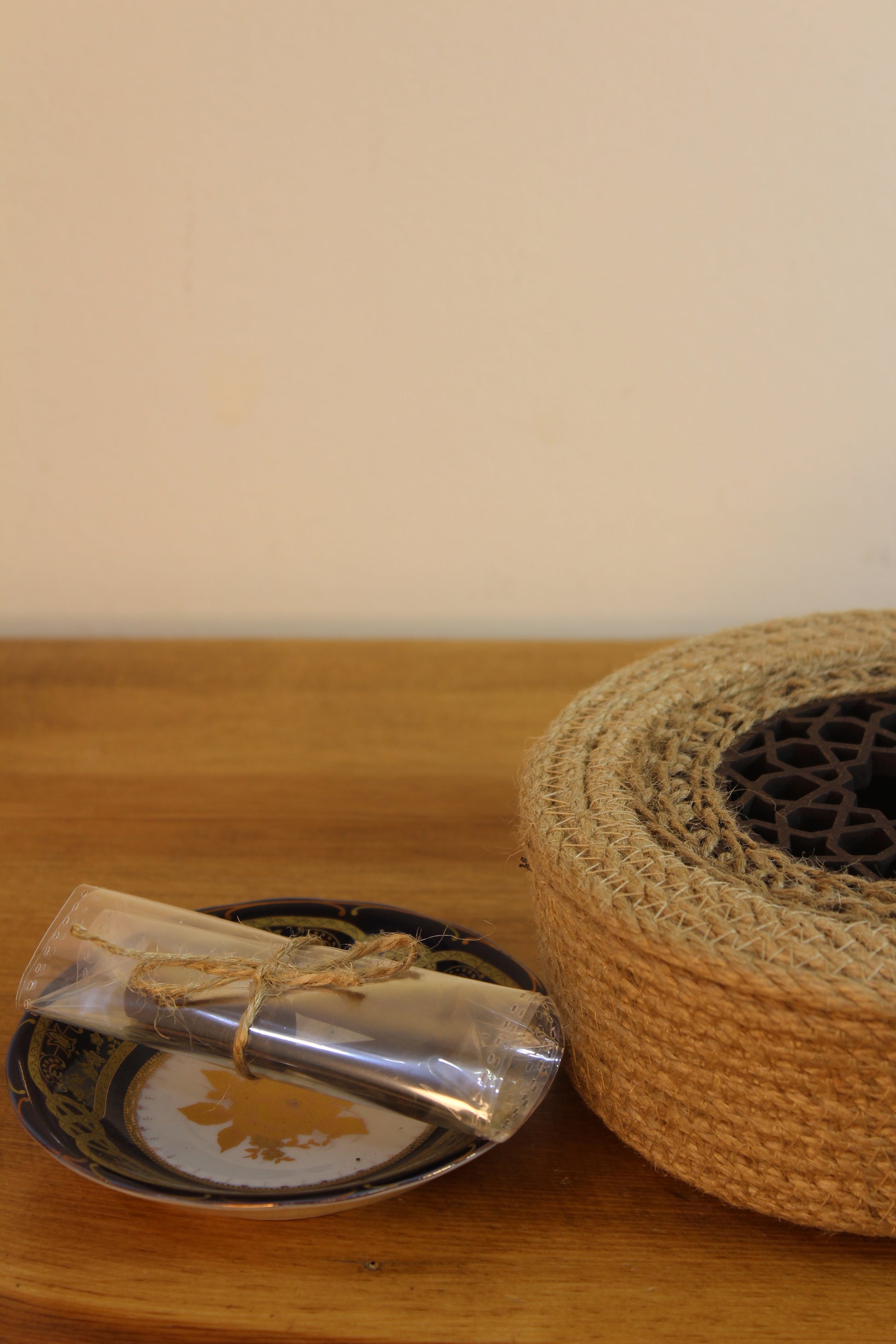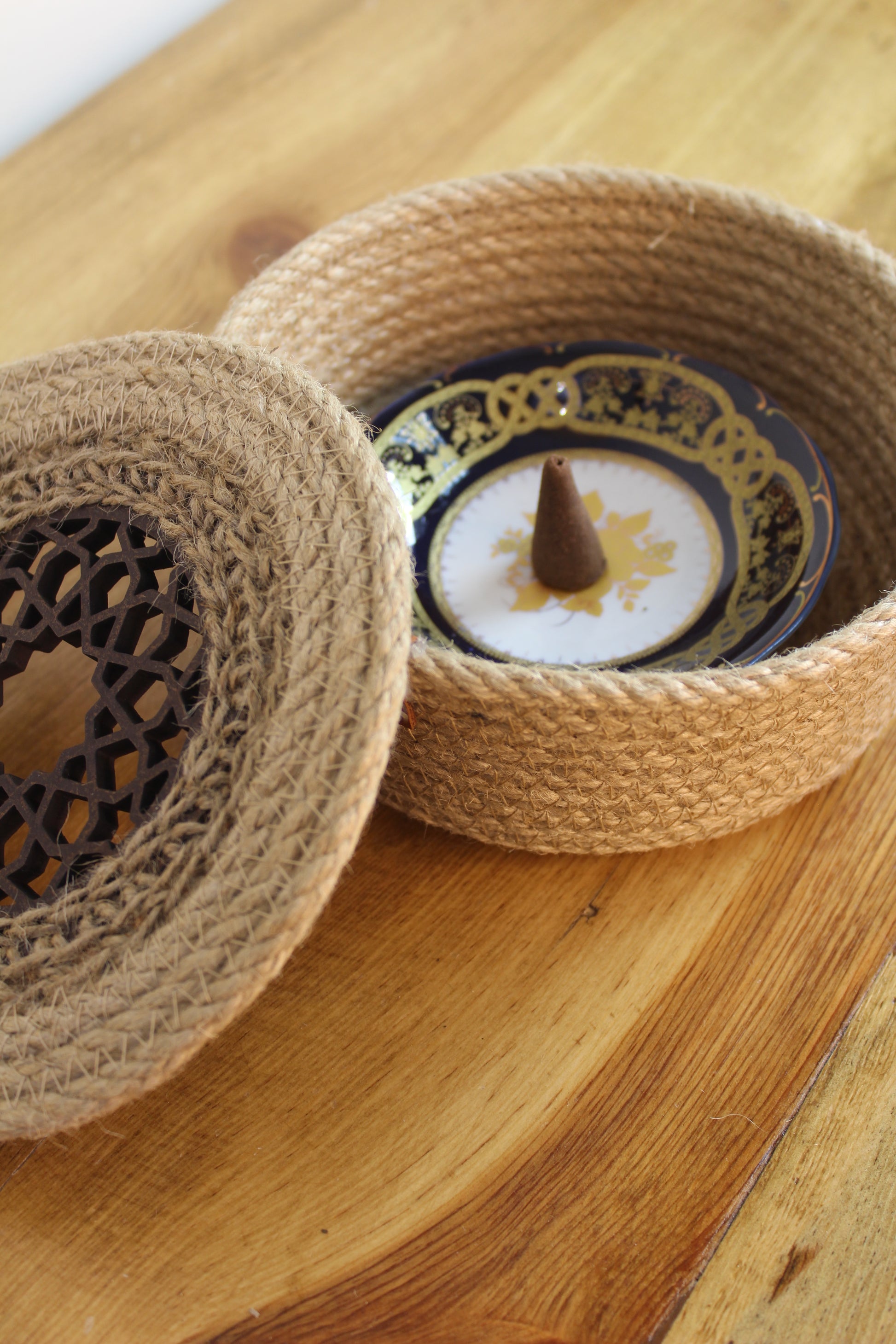 This handcrafted incense holder features a wooden top inspired by traditional Lebanese tile patterns, paired with a natural jute body β compact in size, rich in detail.